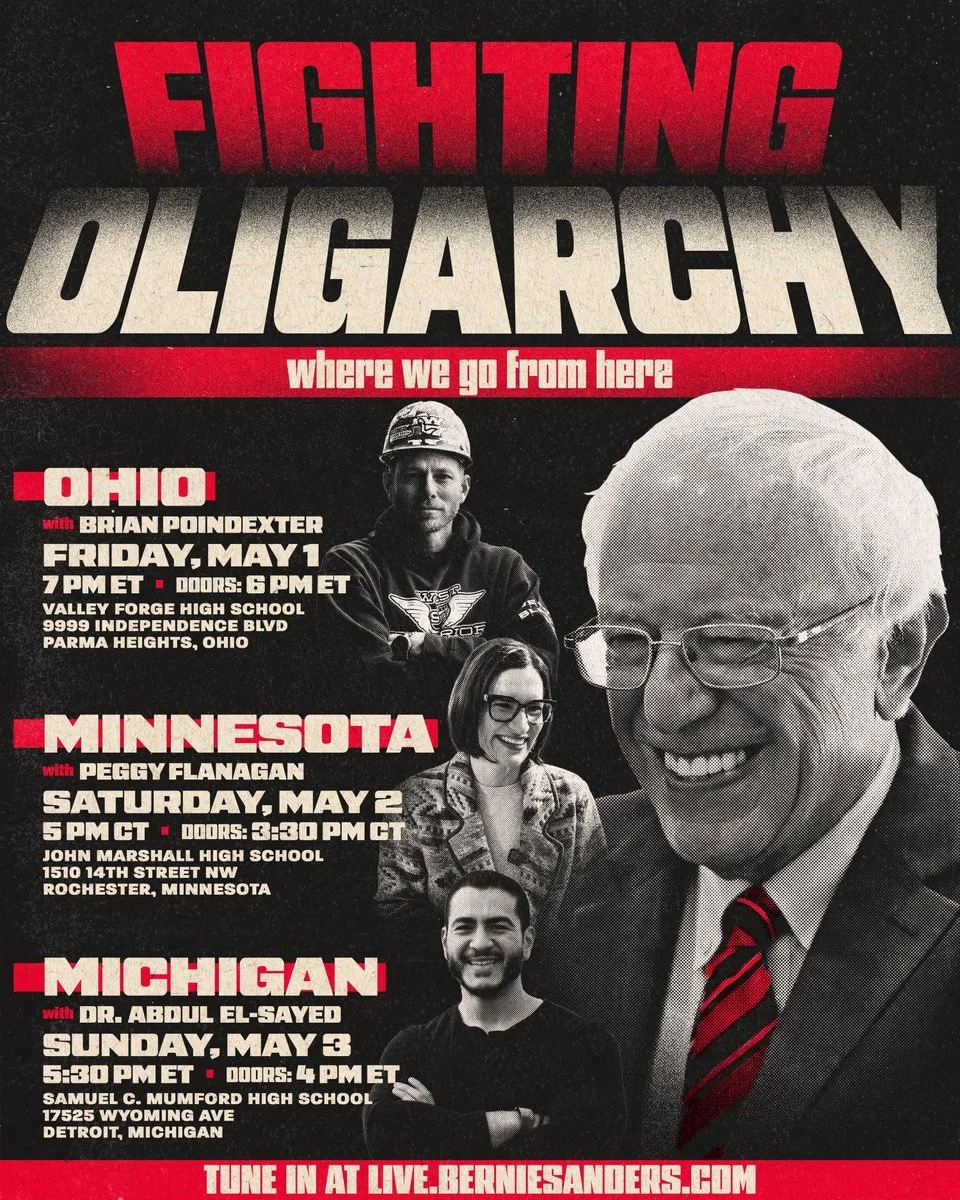 Vermont Senator Bernie Sanders will be at John Marshall High School with Lieutenant Governor Peggy Flanagan and Attorney General Keith Ellison the afternoon of May 2 for an event called Fighting Oligarchy: Where We Go From Here with Bernie Sanders in Rochester.